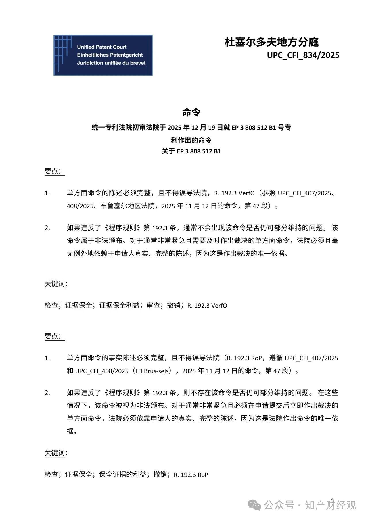 2025年12月19日,UPC 杜塞尔多夫地方分院认定其9月4日作出的单方命令违法,正式撤销该命令(案号:UPC_CFI_834/2025)。