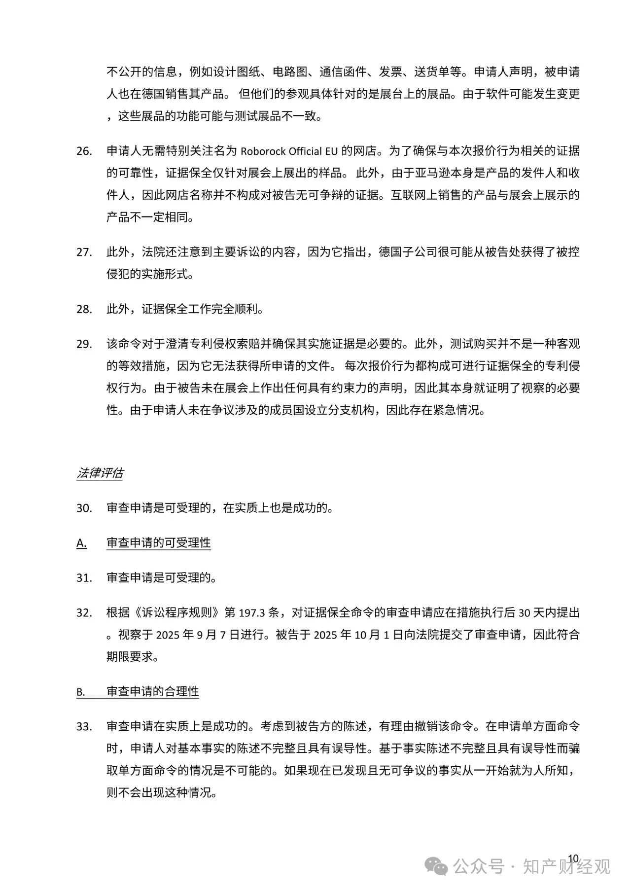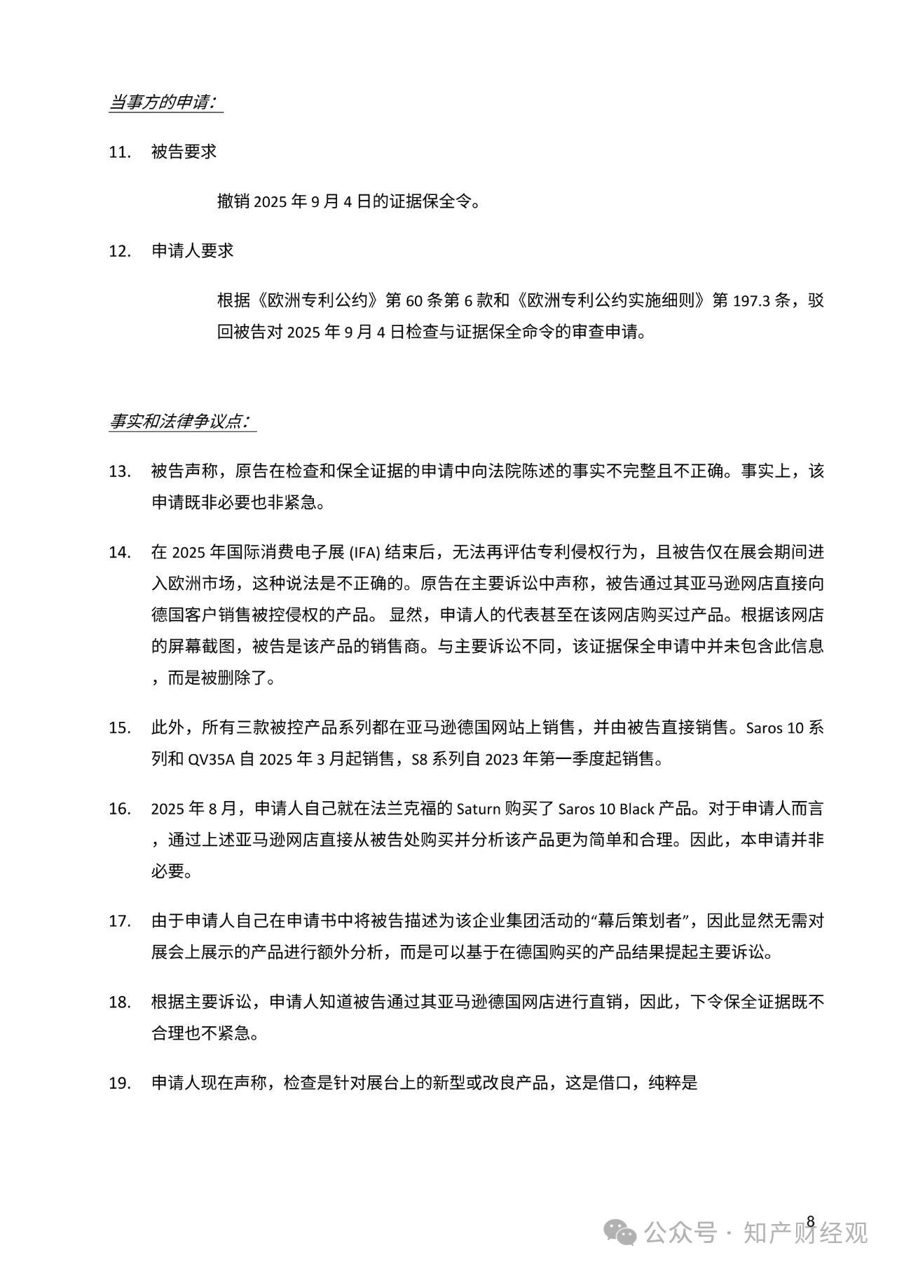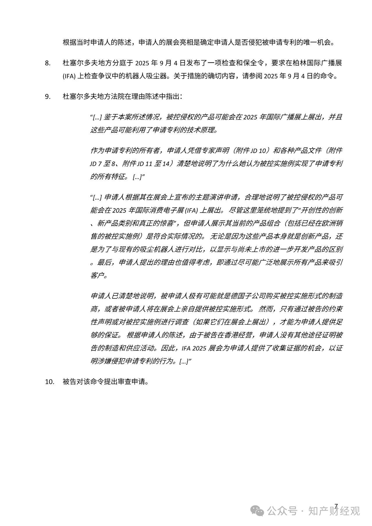 2025年9月4日,UPC 杜塞尔多夫地方分院基于科沃斯的单方申请,作出证据保全及现场检查命令(案号:UPC_CFI_834/2025);