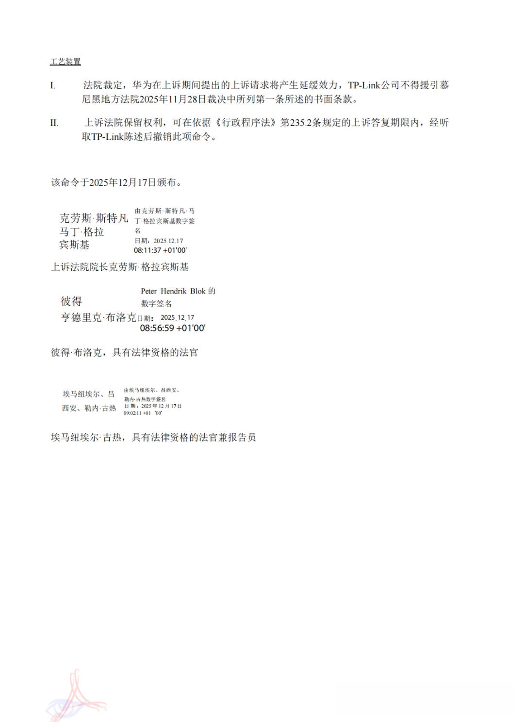 法院同时指出,该裁定属于上诉程序中的临时性措施,并不构成对实体争议的最终判断。待TP-Link提交答辩意见后,法院将进一步审查是否维持或调整该中止决定。