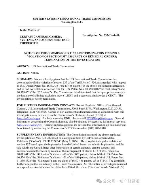2026年2月26日,美国国际贸易委员会(ITC)就GoPro诉影石Insta360专利侵权的337调查(案号:337-TA-1400)作出最终裁定:影石Insta360侵犯了GoPro所持的D789435号外观设计专利,但未侵犯第10958840号专利与第10529052号的实用新型专利。