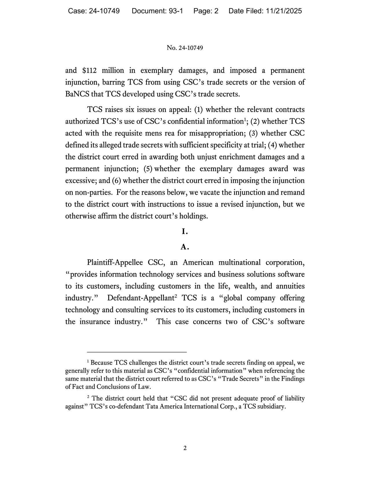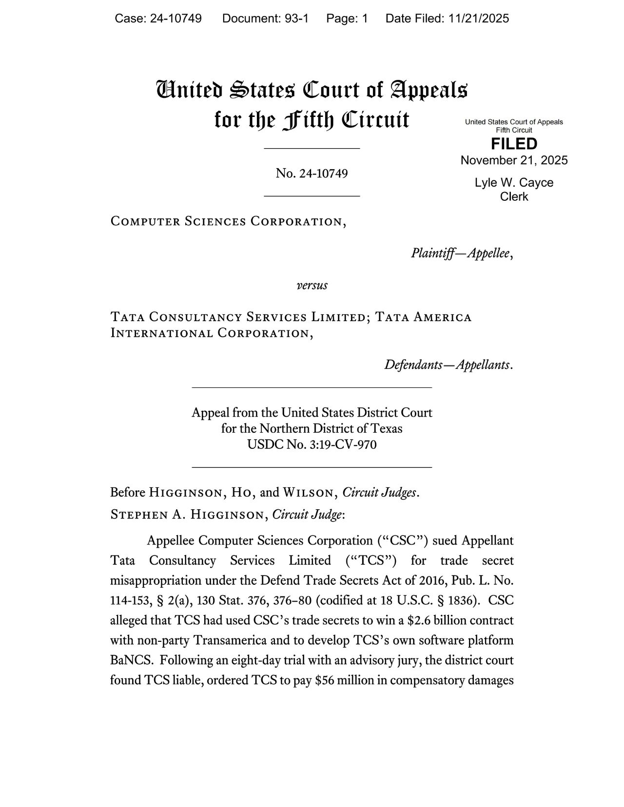近日,美国第五巡回上诉法院维持了联邦地区法院此前对于Tata Consultancy Services Ltd.(TCS)的一项裁决,认定Tata的行为构成商业秘密侵占,并判令其向Computer Sciences Corporation(CSC)赔偿1.68亿美元(约11.92亿元人民币),其中包括补偿性赔偿、惩罚性赔偿以及判决前利息。(案件号:No.24-10749)