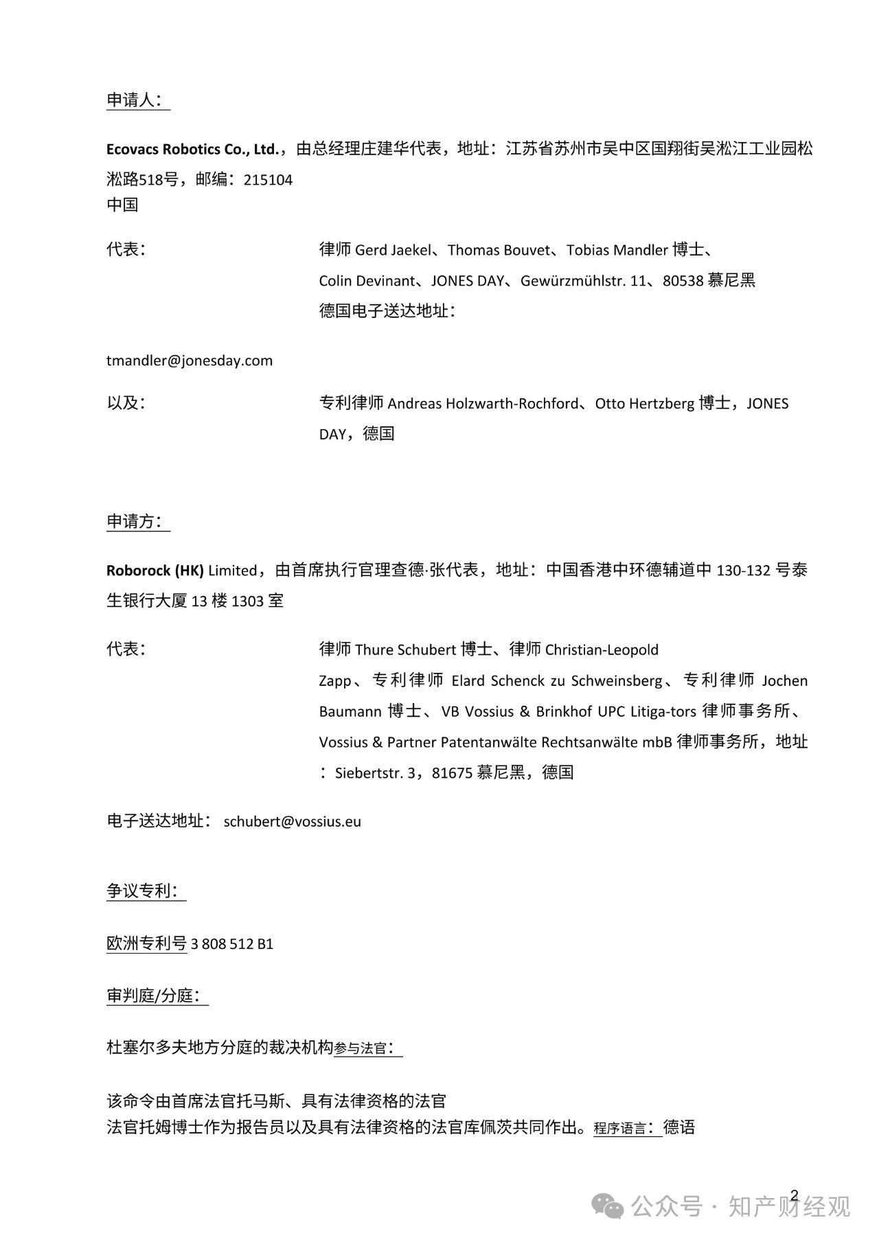 2025年9月3日,科沃斯在欧洲统一专利法院(UPC)杜塞尔多夫地方分院起诉石头科技,指控其在欧洲市场侵犯专利 EP3808512B1(案号:ACT_36001/2025);