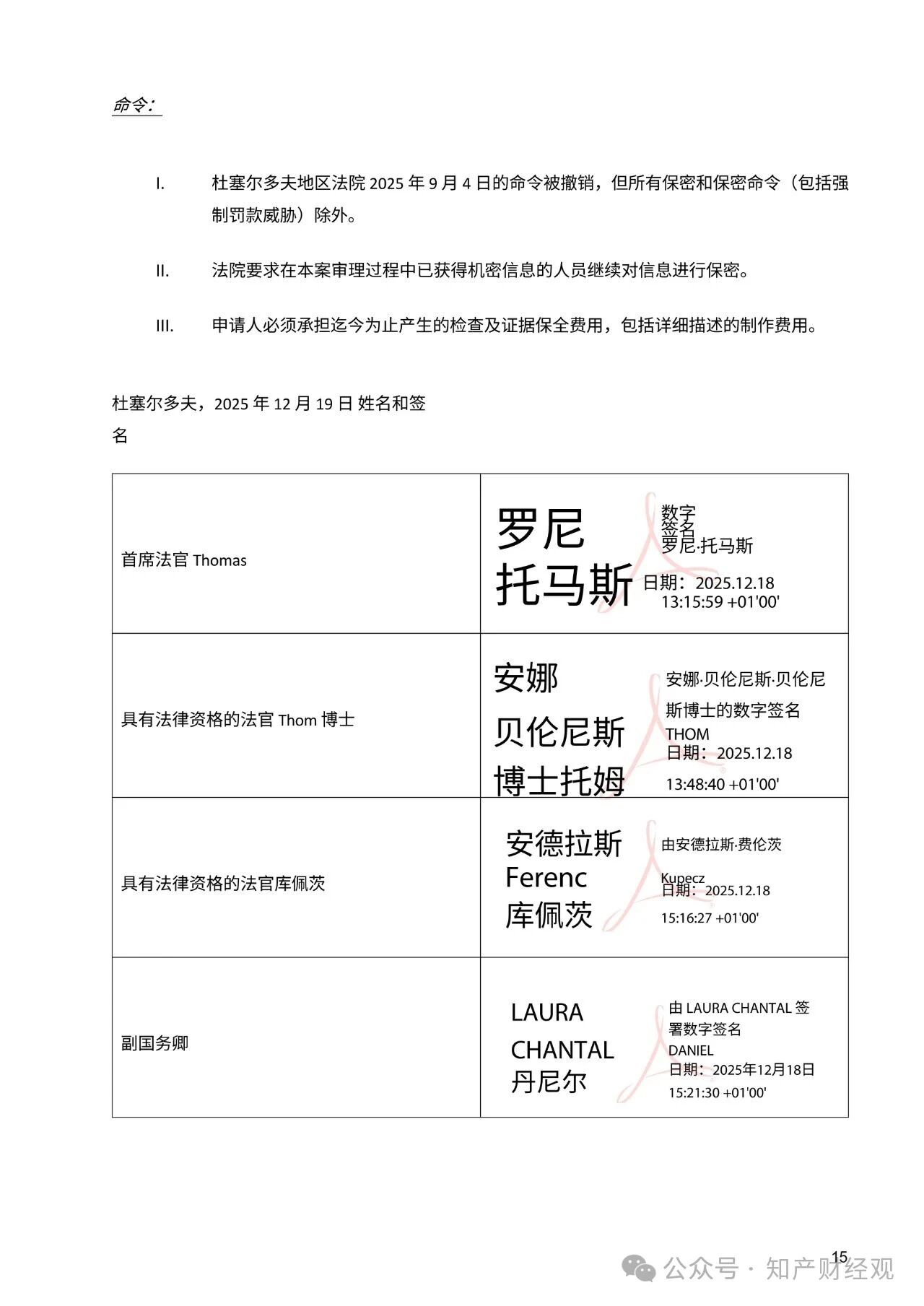 2025年12月19日,UPC 杜塞尔多夫地方分院认定其9月4日作出的单方命令违法,正式撤销该命令(案号:UPC_CFI_834/2025)。