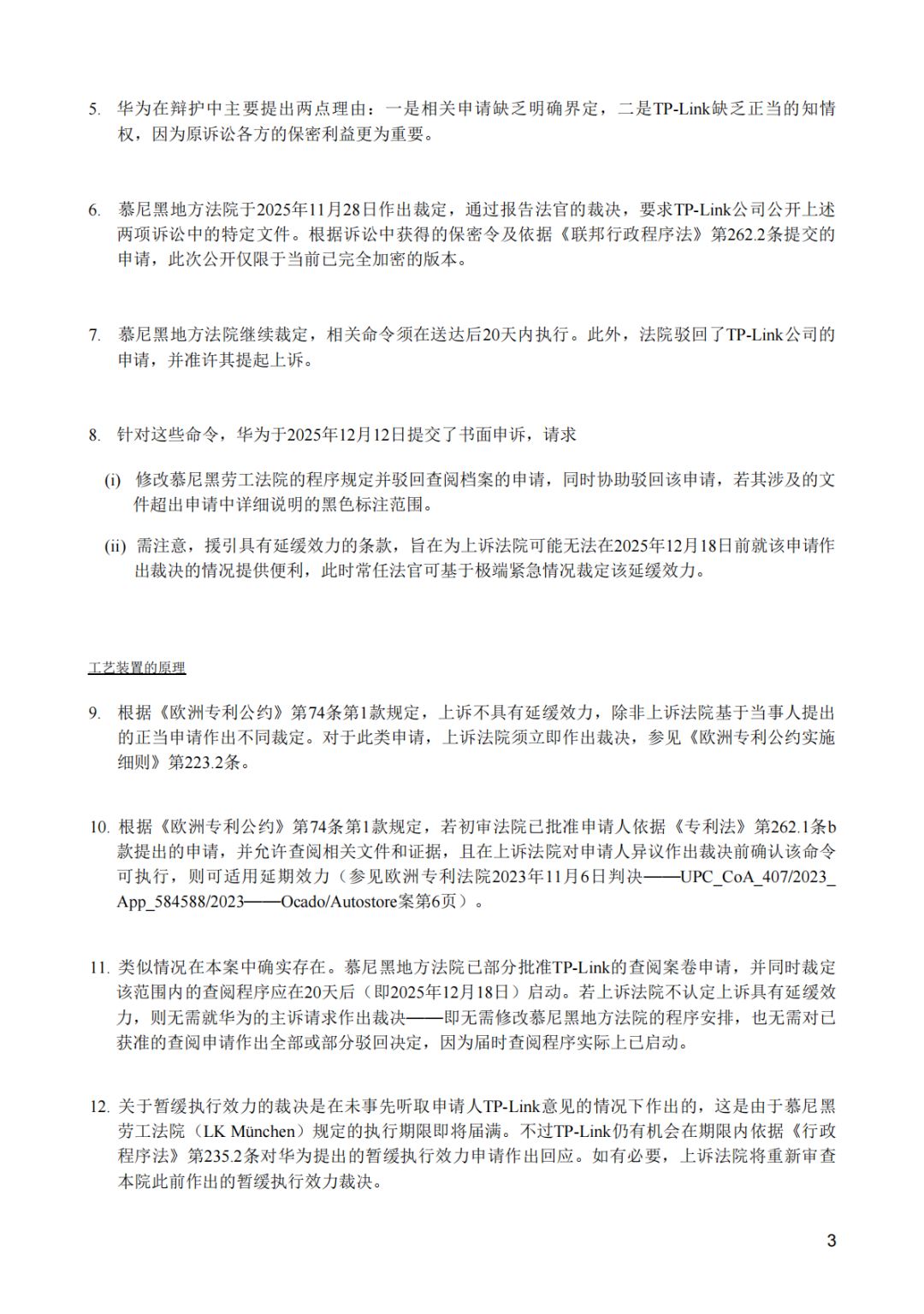 慕尼黑地方分庭在一审中裁定,允许 TP-Link 查阅经脱敏处理后的相关材料,并要求在裁定送达后二十日内执行。华为随后提起上诉,认为相关文件涉及高度敏感的技术和商业信息,一旦披露将造成不可逆损害,并请求在上诉期间中止执行原裁定。