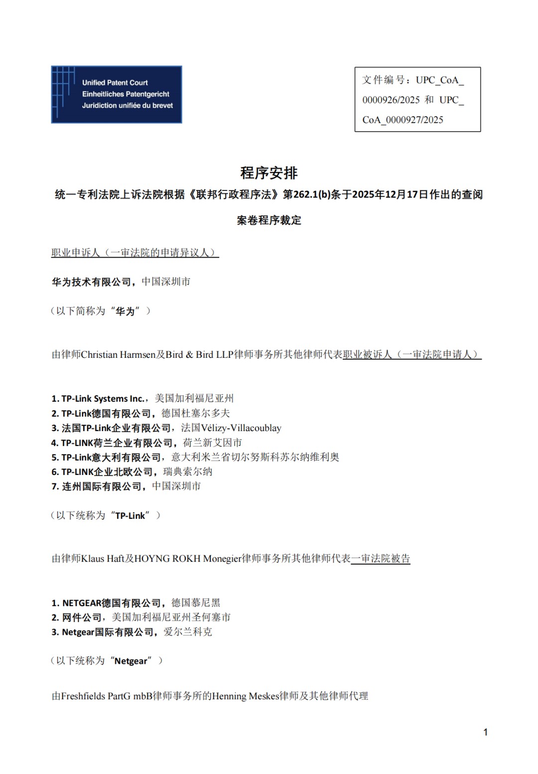 近日,欧洲统一专利法院(UPC)上诉法院就华为技术有限公司(以下简称“华为”)与TP-Link之间的案卷查阅争议作出程序性裁定:在上诉审理期间,暂缓执行此前一审法院允许TP-Link查阅华为与Netgear之间另一起专利诉讼部分文件的决定。