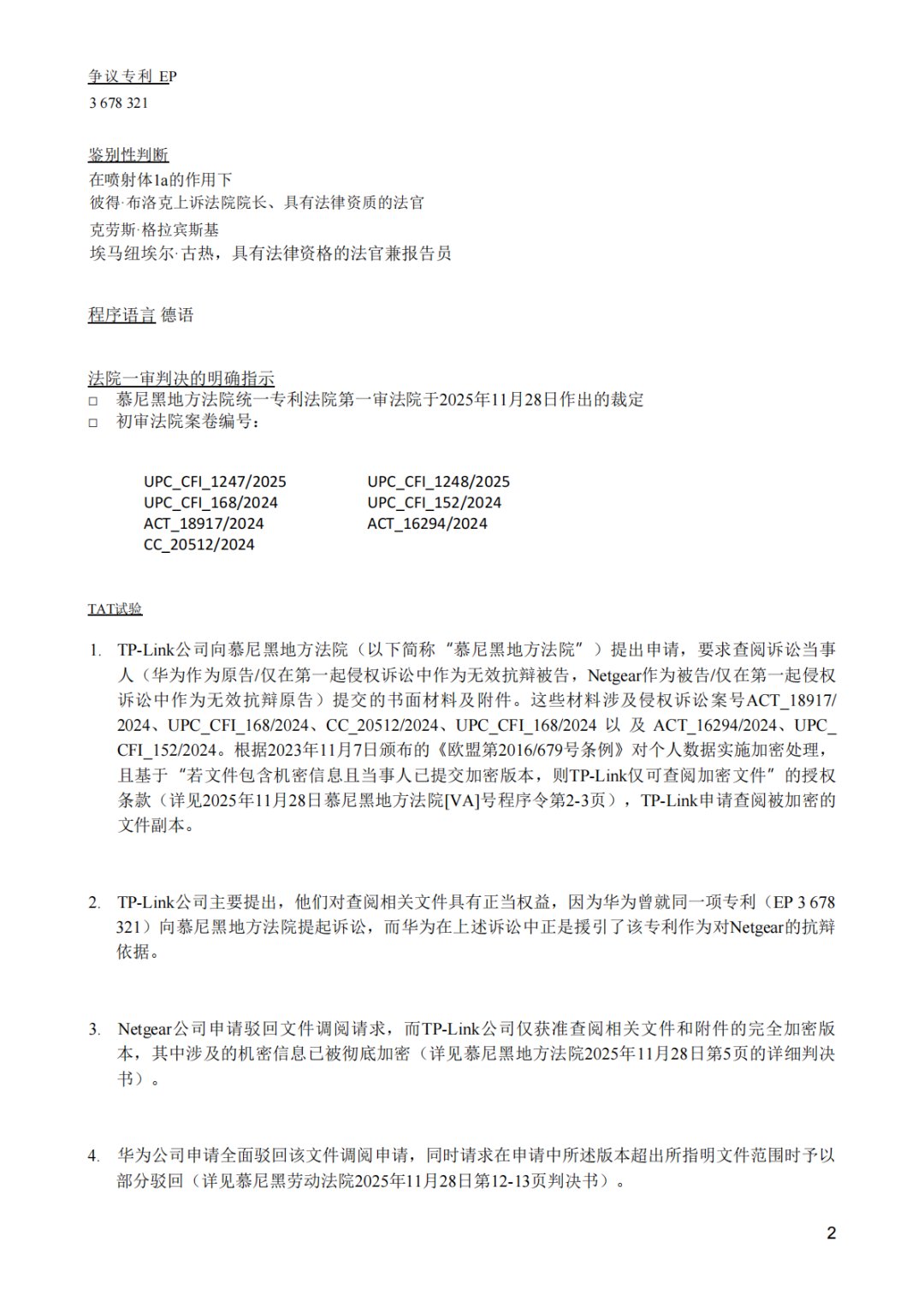 本案围绕华为持有的欧洲专利EP 3 678 321展开。此前,华为就该专利向Netgear 提起专利侵权诉讼。TP-Link因同样被华为就该专利起诉,向法院申请查阅华为与Netgear案件中的部分诉讼文件,主张其对相关材料具有合法知情利益。