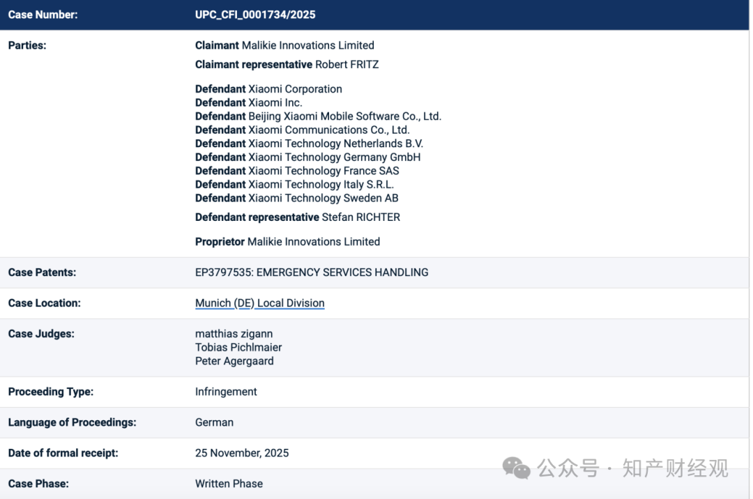 近日,爱尔兰公司Malikie Innovations Limited(以下简称“Malikie”)在欧洲统一专利法院曼海姆地方分庭对小米提起专利侵权诉讼,指控小米多款产品侵犯其所持有的一项5G专利。该案于2025年11月25日正式立案,并于2026年1月由UPC公布在案信息。