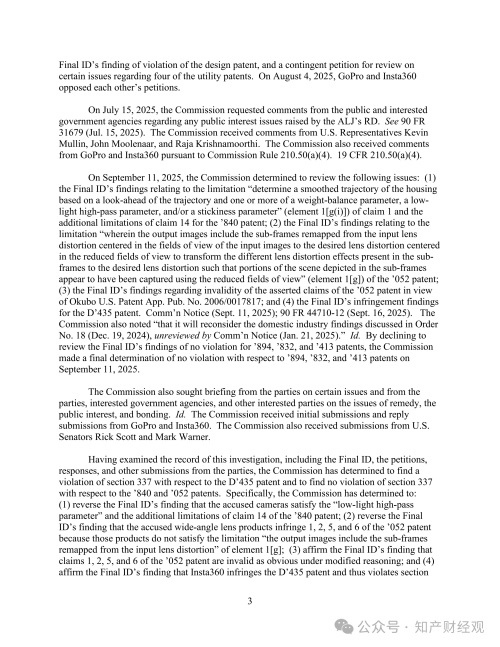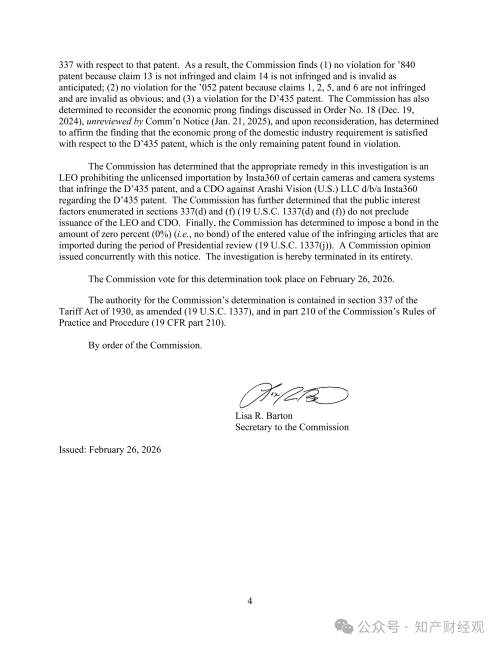 2026年2月26日,美国国际贸易委员会(ITC)就GoPro诉影石Insta360专利侵权的337调查(案号:337-TA-1400)作出最终裁定:影石Insta360侵犯了GoPro所持的D789435号外观设计专利,但未侵犯第10958840号专利与第10529052号的实用新型专利。