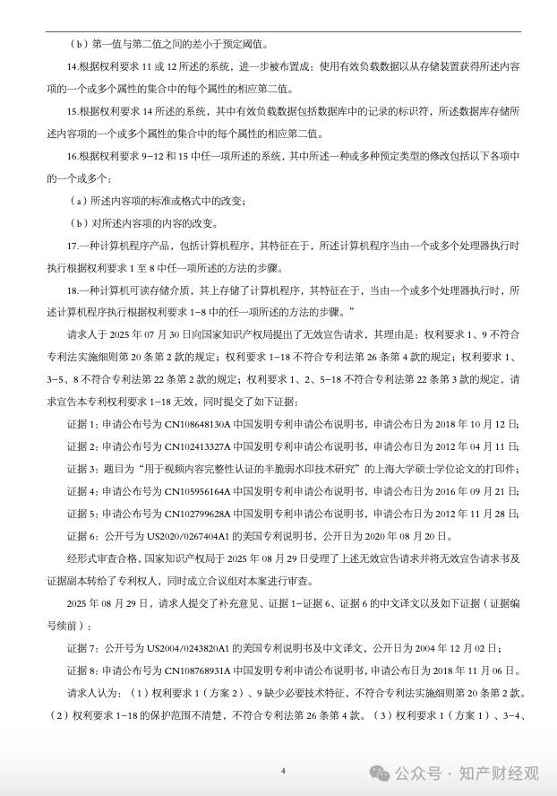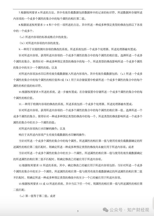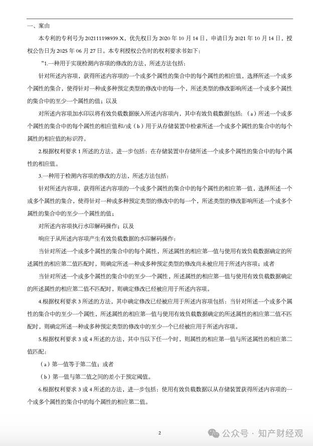 据悉,涉案发明专利申请日为2021年10月14日,优先权日为2020年10月14日,于 2025年6月27日获得国家知识产权局授权公告,国际主分类号为G06F21/16,属于数字水印与内容安全检测技术领域。该专利授权公告时包含18项权利要求,保护范围覆盖实现检测内容项修改的方法、检测内容项修改的方法两大核心方法方案,以及对应的执行系统、计算机程序产品、计算机可读存储介质,核心技术逻辑为通过向内容项嵌入包含属性值或对应检索标识符的水印数据,实现对内容项预设类型修改行为的识别与检测。