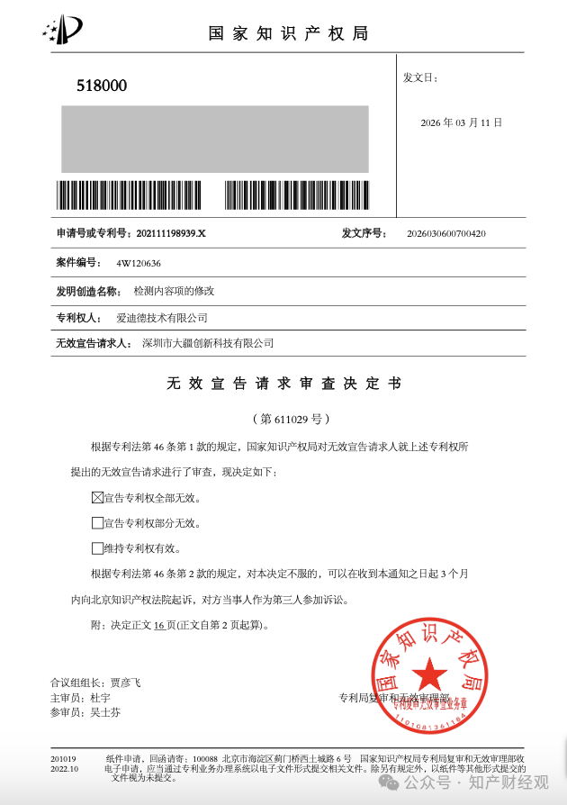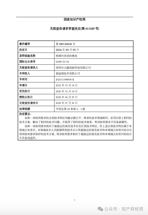 2026年3月11日,国家知识产权局发布第611029号无效宣告请求审查决定书,就深圳市大疆创新科技有限公司(下称 “大疆”)针对爱迪德技术有限公司(下称 “爱迪德”)名下专利号为202111198939.X、名称为 “检测内容项的修改” 的发明专利权提出的无效宣告请求,作出宣告该专利权全部无效的终局审查决定。